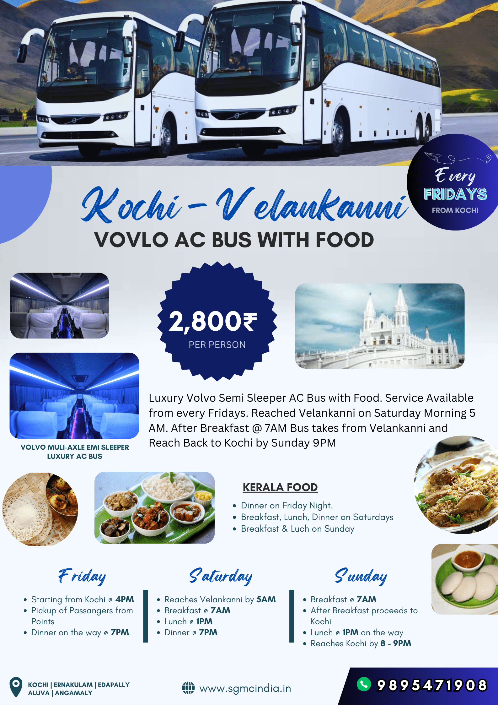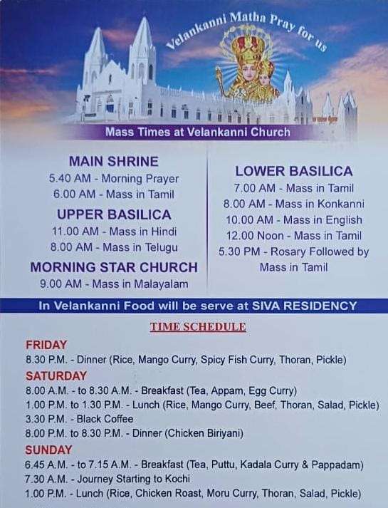 എല്ലാ വെള്ളിയാഴ്ചകളിലും വൈകുന്നേരം 4 മണിക്ക് കൊച്ചിയിൽ നിന്ന് ആരംഭിക്കുന്നു. വെള്ളിയാഴ്ച അത്താഴം വൈകുന്നേരം 7:30 ന് വേയിൽ നൽകും. ശനിയാഴ്ച രാവിലെ 5 മണിക്ക് വേളാങ്കണ്ണിയിൽ എത്തും. രാവിലെ 7 മണിക്ക് പ്രഭാതഭക്ഷണം നൽകും. രാവിലെ 9 മണിക്ക് മോർണിംഗ് സ്റ്റാർ പള്ളിയിൽ മലയാളം കുർബാന നടക്കും. ഉച്ചയ്ക്ക് 1 മണിക്ക് ഉച്ചഭക്ഷണം നൽകും. വൈകുന്നേരം 4 മണിക്ക് ഞങ്ങൾ ചായ നൽകും. വൈകുന്നേരം 7 മണിക്ക് അത്താഴം നൽകും. ഞായറാഴ്ച രാവിലെ 7 മണിക്ക് പ്രഭാതഭക്ഷണം നൽകും, അതിനുശേഷം 7:30 ന് വേളാങ്കണ്ണിയിൽ നിന്ന് ബസ് പുറപ്പെടും. വഴിയിൽ ഉച്ചഭക്ഷണം ഉച്ചയ്ക്ക് 1 മണിക്ക് നൽകും. വാഹനം രാത്രി 8:30 ന് കൊച്ചിയിൽ എത്തും